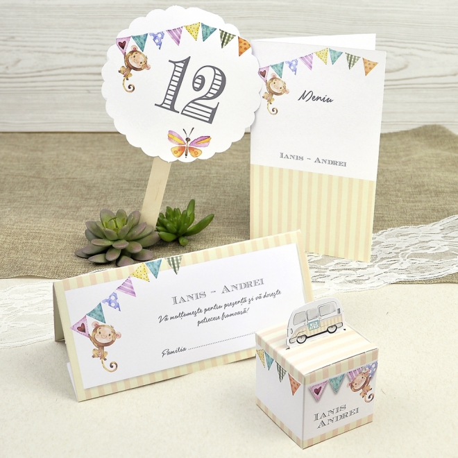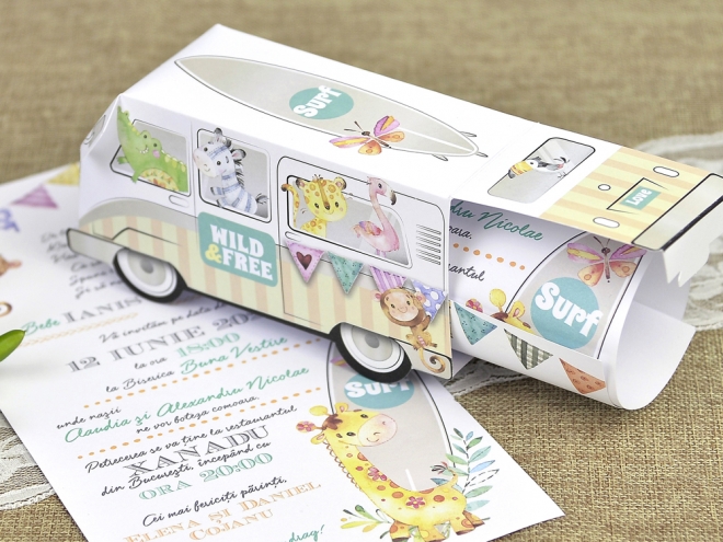 Include: invitatia pe care se tipareste textul, plicul in forma de masinuta.