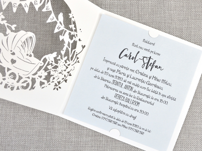 Include: cartonul exterior decupat prin procedeu laser, cartonul interior pe care se scrie textul, plicul invitatiei.