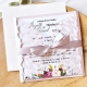 O invitatie de nunta elegantă și romantică, model din dantela decupat prin metoda laser, accesorizata cu o panglică potrivită.