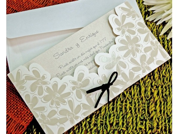 Invitatie de nunta cu model floral si snur negru din piele ecologica. Cartonul sidefat din interiorul invitatiei este destinat tiparirii textului.