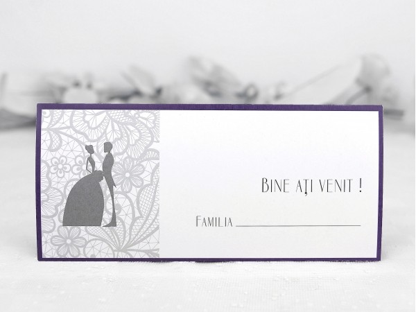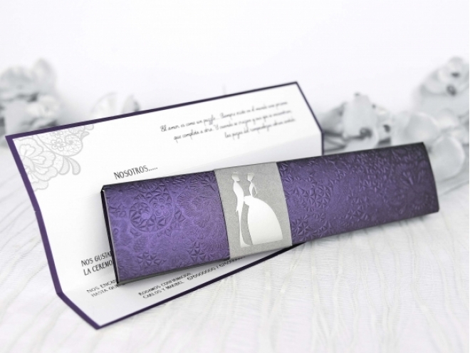 Invitatie de nunta originala, in forma de cutie, confectionata dintr-un carton decorat cu flori embosate.