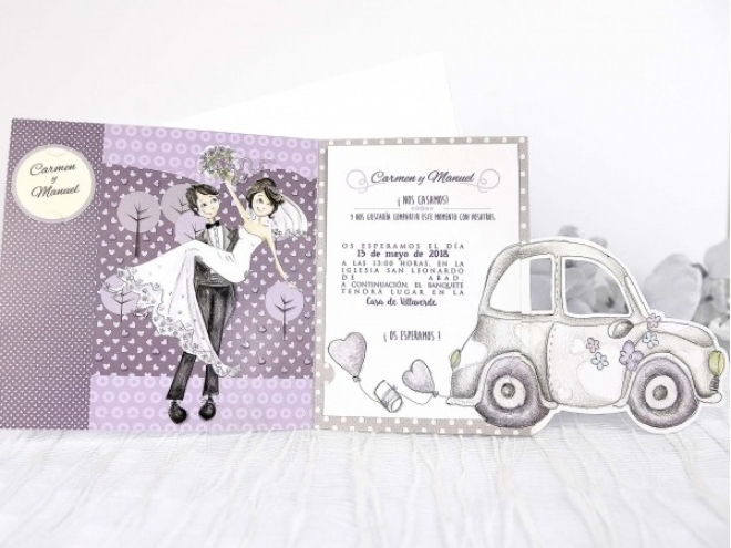 Invitatie de nunta cu personaje desenate in stil comic. Formata din 3 componente: cartonul pe care se scrie textul, bilelelul rotund aplicat in partea stanga a invitatiei si care prezinta numele mirilor si cartonul principal cu imaginea celor 2 miri. Plicul este inclus in pret.