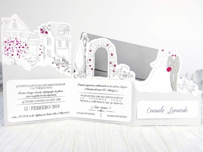 Invitatie de nunta model mire si mireasa confectionata dintr-un carton de culoare alba cu motive romantice. Invitatia se deschide pe orizontala. Plicul de culoare gri este inclus in pret si nu se poate tipari.