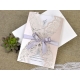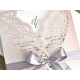Invitatie de nunta eleganta compusa dintr-un carton alb cu text, un carton exterior cu model dantelat taiat la laser si accesorizata cu o fundita mov. Plicul de culoare alba este inclus in pret.