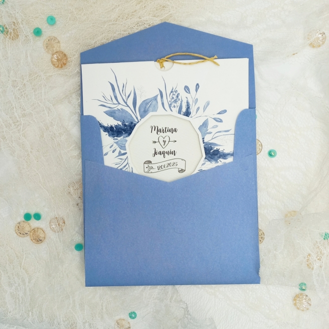 O invitatie de nunta eleganta, compusa dintr-un carton cu decor floral ce pare o pictura realizata in tehnica acuarela. Acesta prezinta un decupaj in forma hexagonala prin care se poate vedea o parte din textul invitatiei. Accesorizat cu snur kraft.
