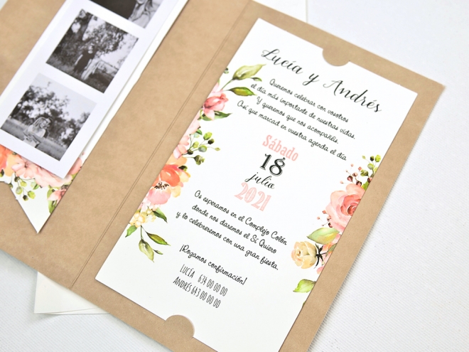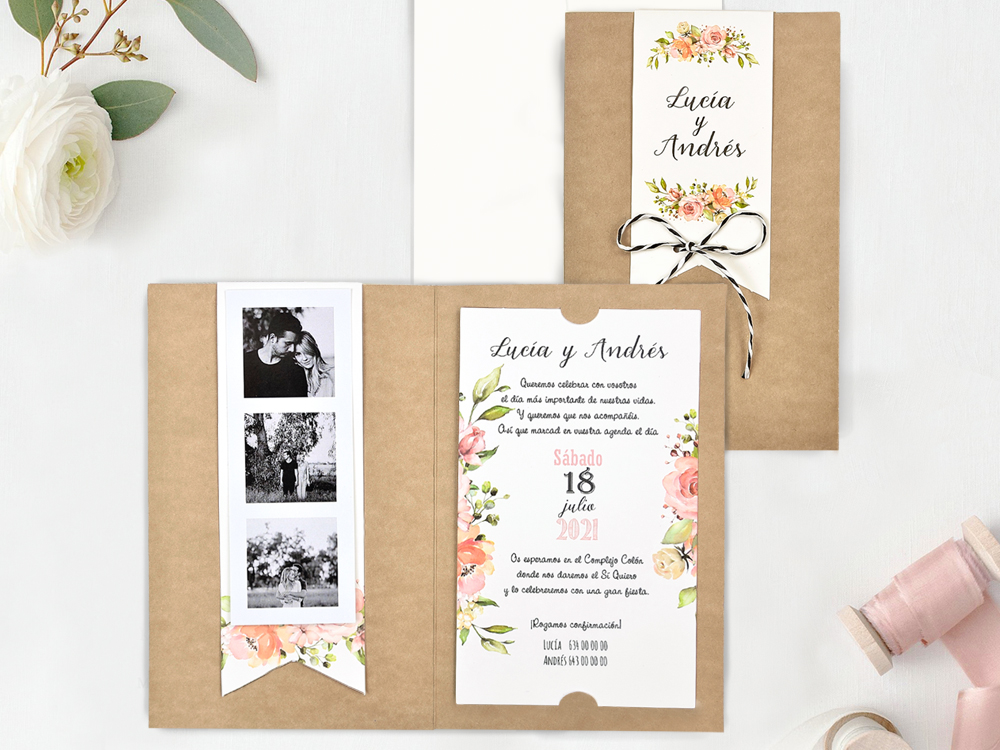 Invitatie de nunta in stil boho chic, confectionata dintr-un carton de culoare maro pe care se prinde o banda cu elemente florale, accesorizata cu un snur de culoare alb-negru. In interior, pe banda se pot lipi poze, ca in prezentare. Cartonul pe care se tipareste textul se prinde de cel maro cu ajutorul a 2 mici urechiuse. Acesta este decorat in acelasi stil cu restul invitatiei. Plicul este inclus in pret.