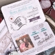 Compusa din: carton care se pliaza in forma de carte, pe fata - amprente deja definite / pe spate - textul invitatiei, elemente grafice si poza mirilor (o veti trimite pe e-mail dupa plasarea comenzii), biletul de avion, plic simplu, snur din hartie in culori alb-negru si biletelul rotund personalizabil cu numele mirilor si data evenimentului.