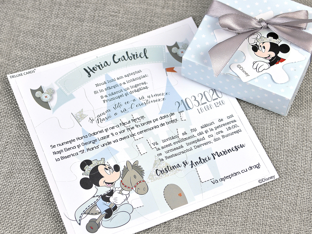 Aceasta invitatie are un format interesant tip puzzle si il prezinta pe Mickey imbracat in print.